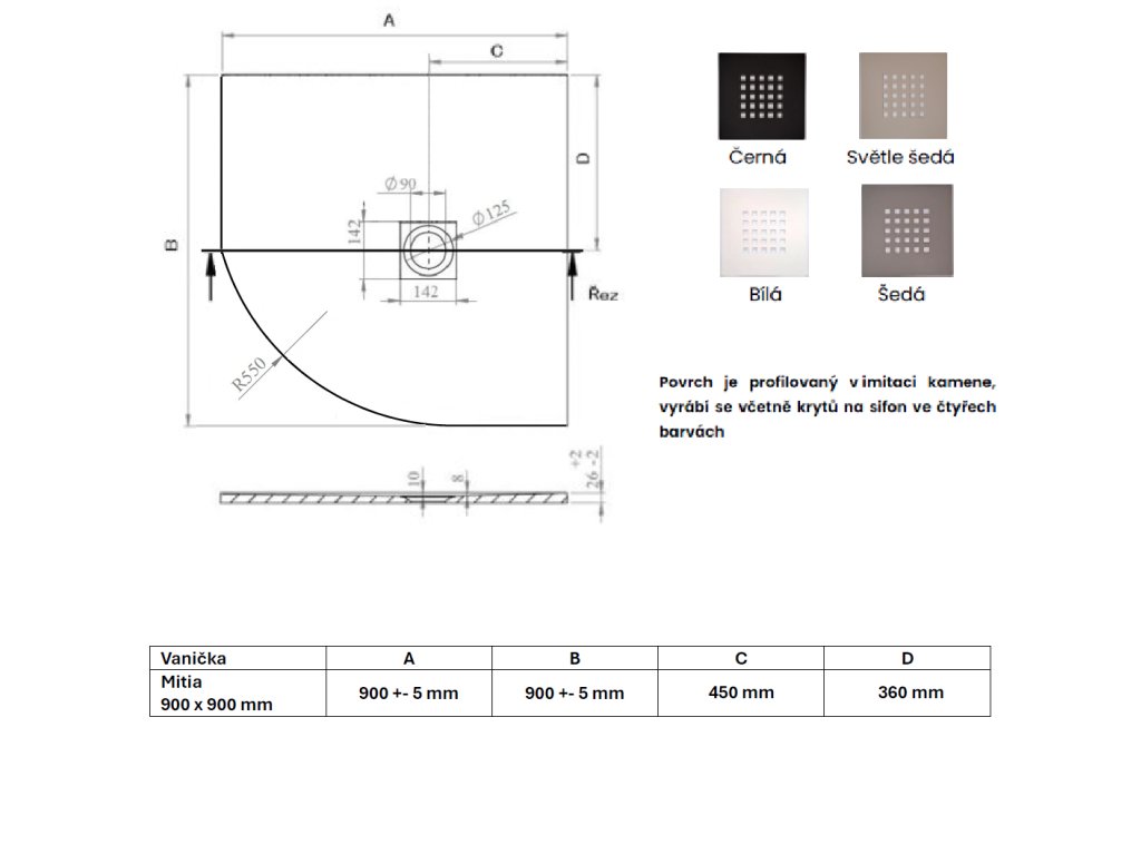 Sprchová vanička MITIA PMCR90 900x900 mm, černá profilovaná